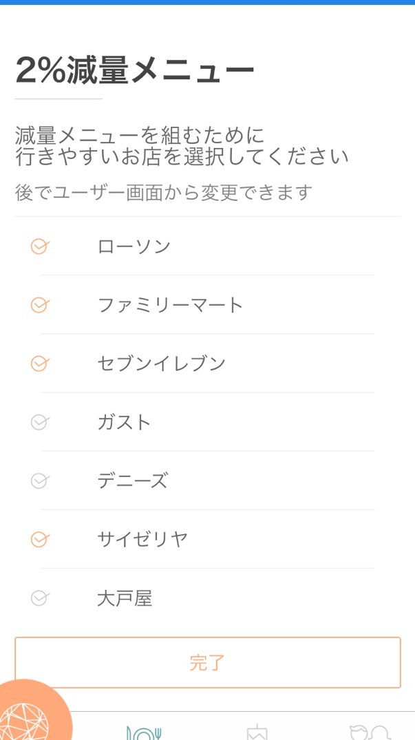 外食のプログラムでは質問からAIがあなたの傾向や好みを分析し、700万通りものメニューから適した食事のメニューを作成。よく立ち寄るコンビニや飲食店を登録できるため、実際の買い物やオーダーの参考になり便利です。