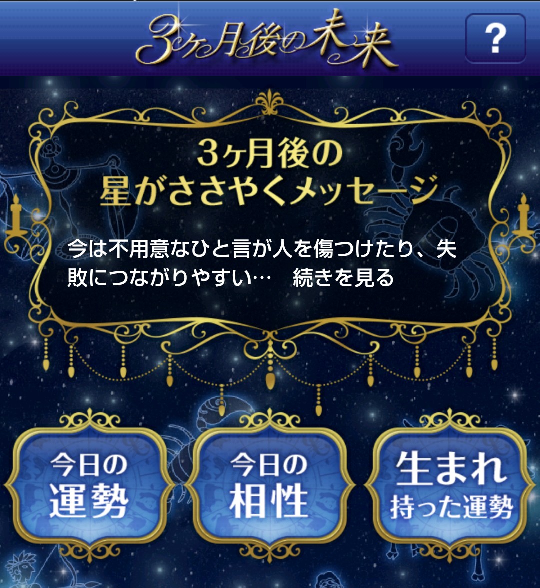 今起きている辛い出来事も、幸せな未来への道標。そう思えたら、大体の事は乗り越えられそうですよね。そんな未来の出来事を占ってくれるアプリ「3ヶ月後の未来」。3ヶ月後あの人と結ばれているのか?3ヶ月後のあの人との関係は?など、特に恋愛運を重点的に占いたい人へおすすめの内容となっています。気になるあの人との未来、あなたは知る勇気がありますか?