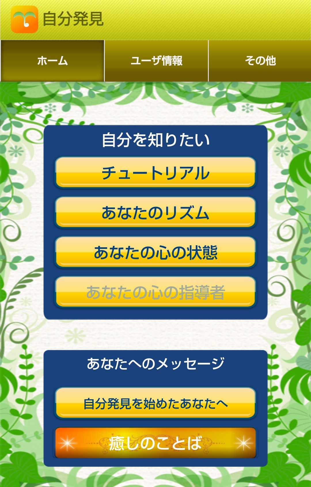 自分の中にある幸せの種を見つけるきっかけになるアプリ「自分発見」。チュートリアルとなる6つの質問で、自身の本質を見る事から始まります。チュートリアル後は、心のバイオリズムや今の心理状態を50問の心理テストで知る事が出来ます。1問1答で診断出来る心理テストでは物足りなさを感じている人、毎日の心のバイオリズムを知りたい人におすすめの内容です。