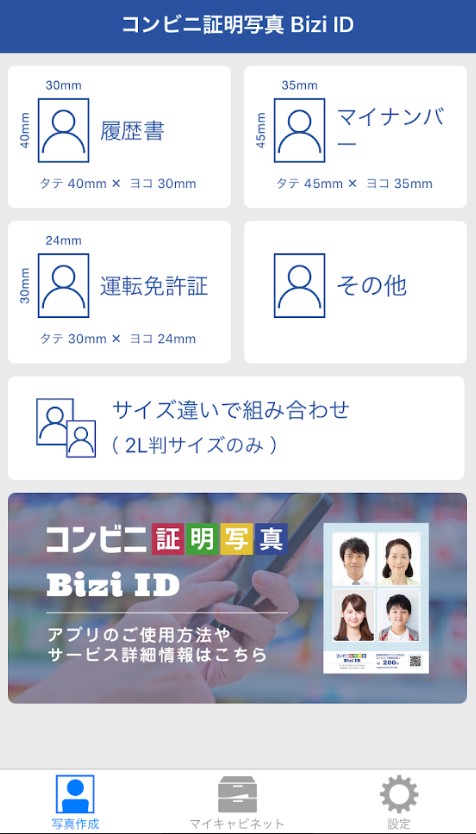 Bizi IDは、全国の主要コンビニ(ローソン、ファミリーマート、サークルK、サンクス)でプリントできる証明写真アプリです。料金は「履歴書用証明写真6枚で200円」となっており、その他各種証明写真にも対応しています。また規定のサイズだけでなく、最小2センチ~最大7センチでフリーサイズの写真も作成可能。1度登録しておけば、アプリを消去しない限り、半年間コンビニのプリント番号が有効なので、必要に応じて何度も利用できます。