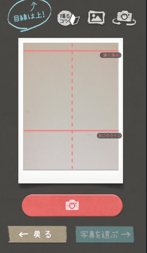 撮影時にはガイドラインが表示されるので、それに沿って撮影するだけの手軽な仕様になっています。撮った写真は画像補正、フィルタ、明暗、色など細かい加工・調整が可能なので、自分なりに納得のできる1枚を追求することもできます。