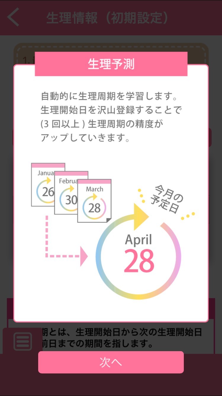 日・週・月別に表示切替が可能なカレンダーで、次の生理日予測や過去の生理記録を確認できます。生理データに基づいた、妊娠の可能性チェックや体調の乱れ、心の状態などのアイコンを簡単に登録可能です。