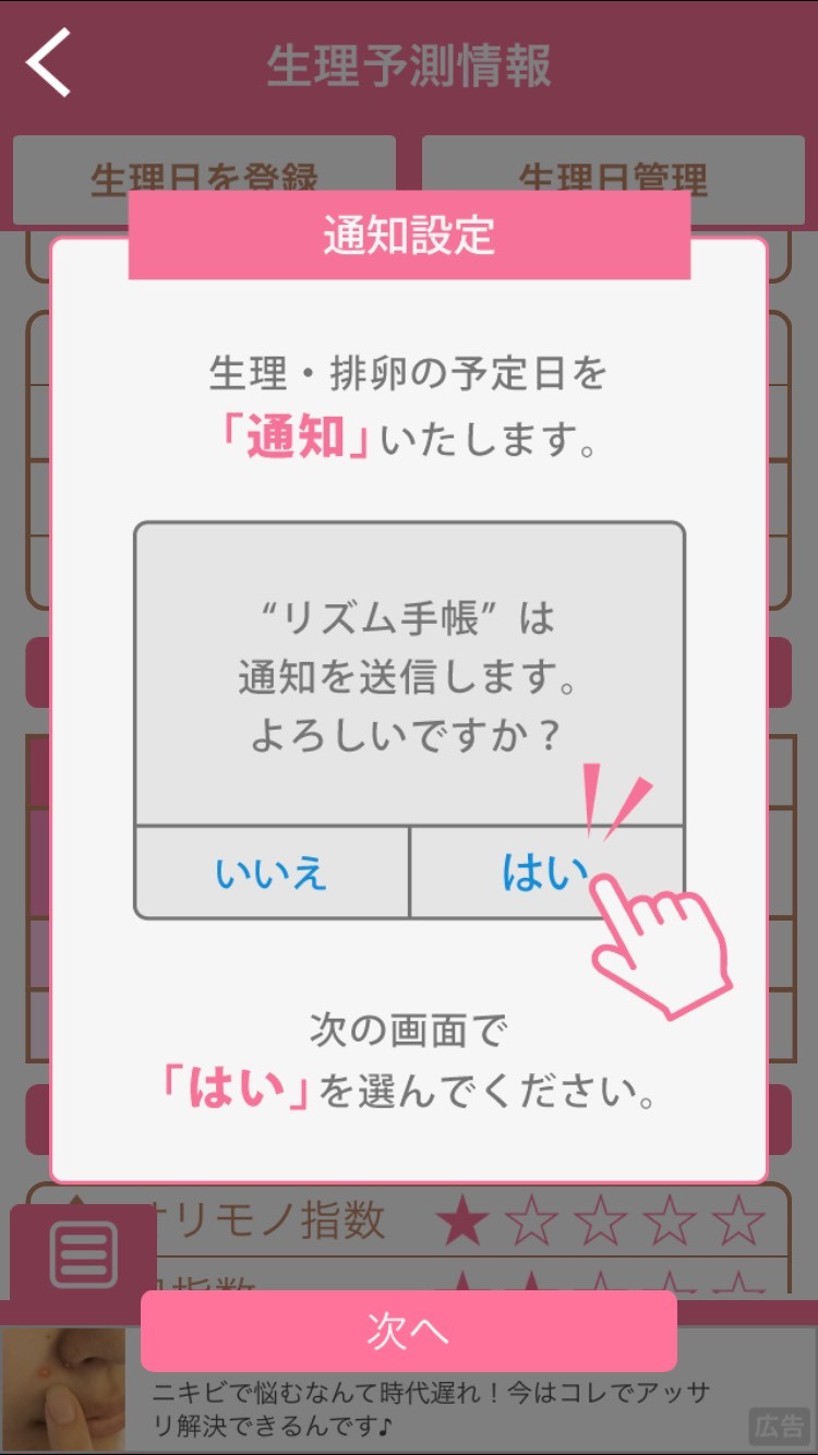 生理開始日・終了日を登録すると、次回の生理日・排卵日を予測。生理データを基に、妊娠の可能性予測もしてくれます。また日々のあなたの体調を、オリモノ指数・肌指数・カラダ指数・イライラ指数・ダイエット指数でわかりやすく通知。
