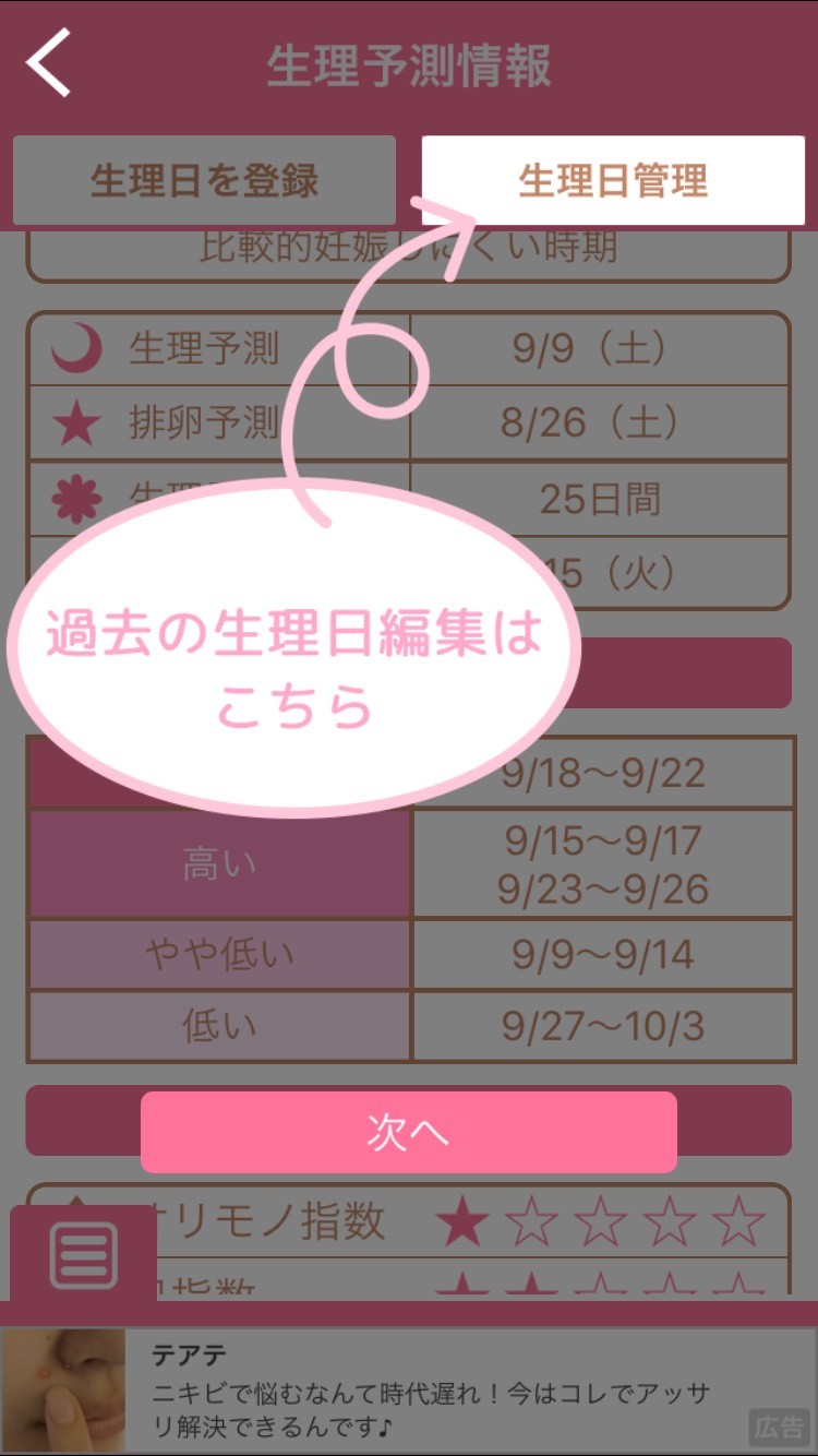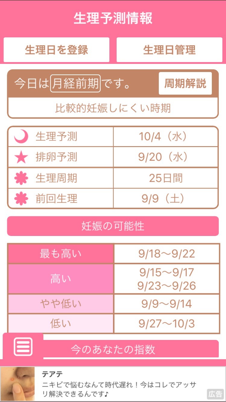 無料でここまで使えるのが「すごい!」の一言。アプリを開くと、「今日は黄体前期です。妊娠しやすい時期です。」などのメッセージが表示され、生理予測日、排卵予測日が確認できます。周期の詳細を知りたい場合は、周期解説を読むと今の自分の身体の状態をより理解できます。また、イライラ指数やダイエット指数といった指数が、自分のバイオリズムを日々確認できて便利です。女性特有のホルモンの移り変わりを理解し、体調管理に役立ちます。