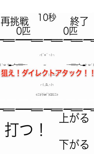 「狙い撃つぜ」、こちらは一人でインベーダー(ニコニコしている)を画面の端からライフル状の武器で(これもかなり頑張っている絵です→2チャンネル的文字で作ったライフル表現)上から現れる敵を打ちまくるというシンプルなゲームです。自分も顔文字で基本ニコニコ系の顔文字ですから、なんとも迫力はない。とほほ系シューティングゲーム。上部から敵が流れてきたら、スナイパーを上に、真ん中なら真ん中に移動させその上で撃たなければなりません。これが意外とやっかいで、上の敵を倒したと思ったら次は下の敵がすぐに登場。とろとろとしていると打ち損なってしまいそうです。じれったい動きがもどかしい。