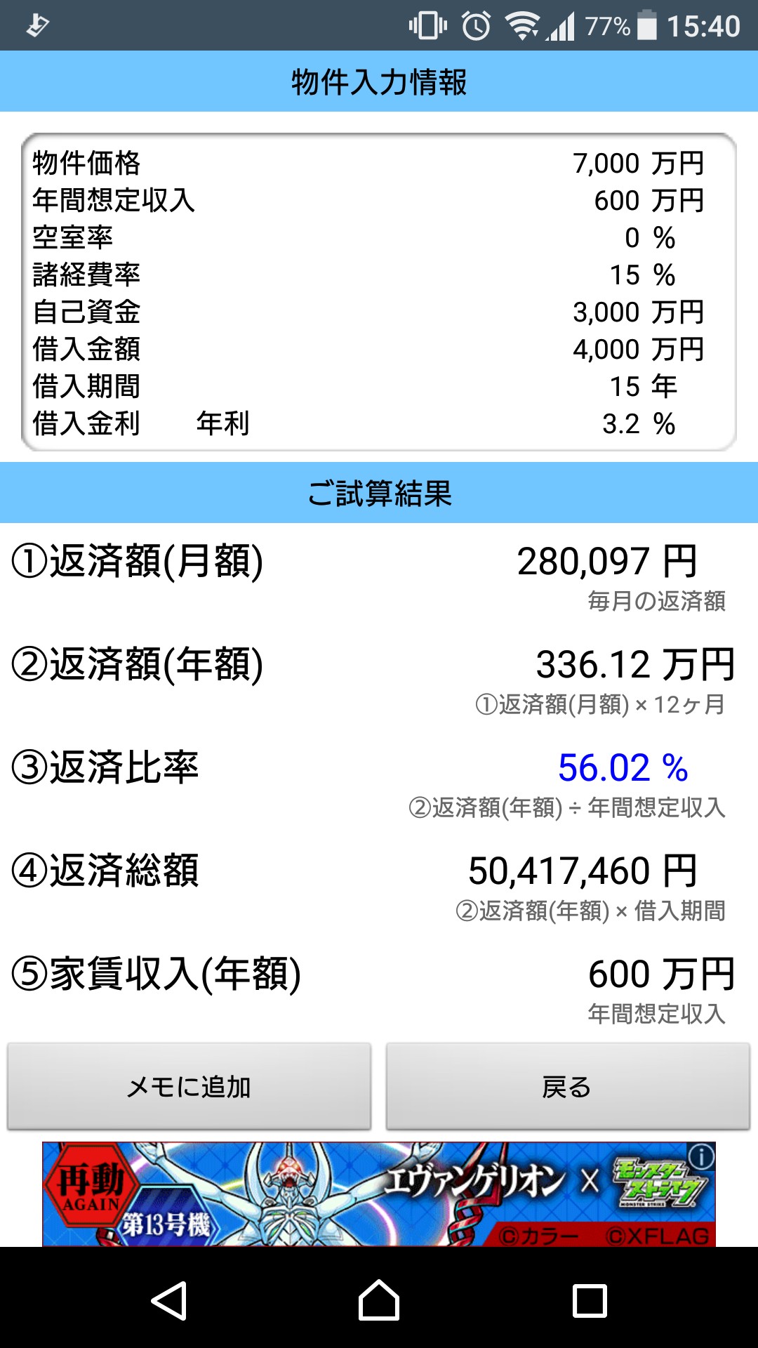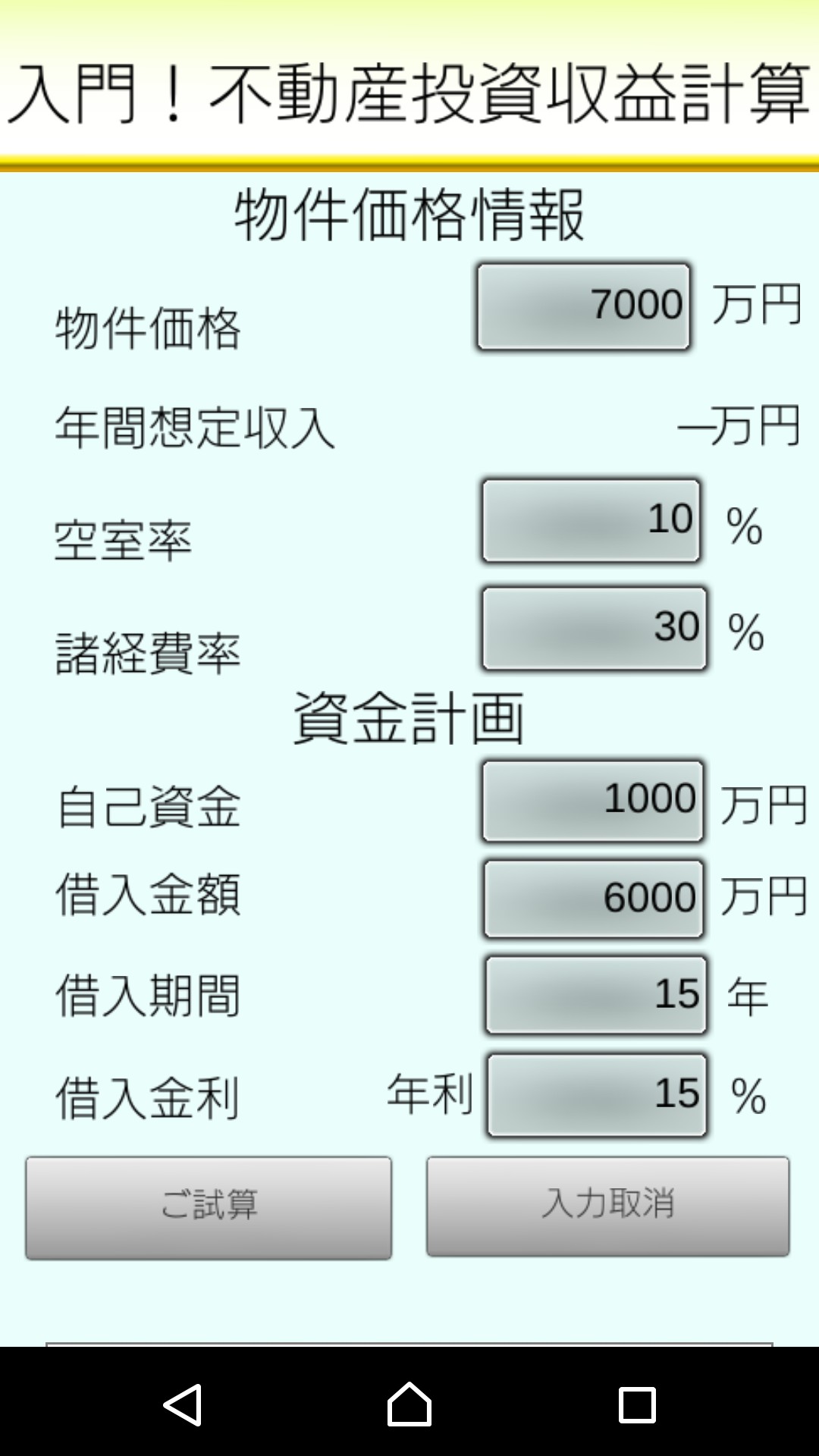 このアプリは、物件価格、自己資金、借入期間など不動産投資に必要な情報を入力するだけで、物件の収支を簡単に計算してくれるお助けアプリです。