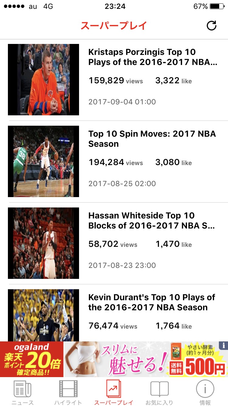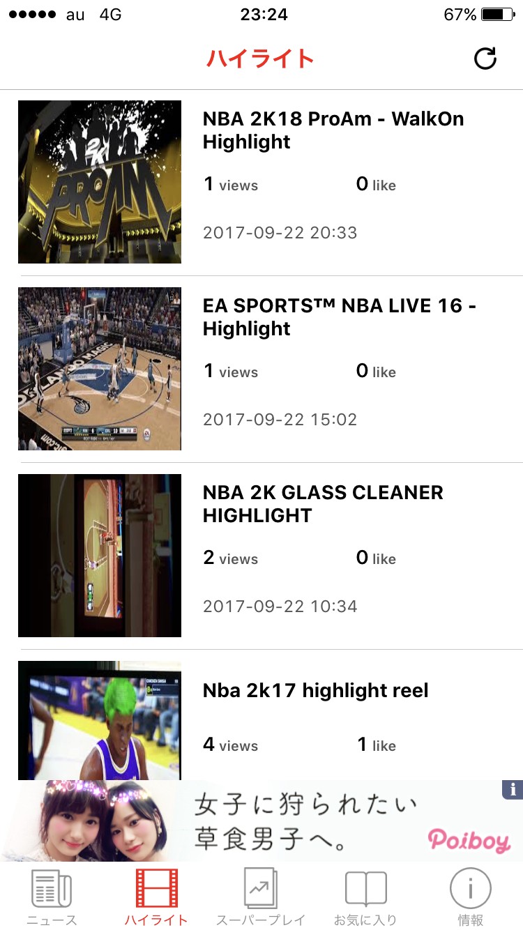 また、そんなスーパープレーの他にも、様々な試合のハイライトが見られるので、ハイライトシーンを毎日追い求めているバスケ好きには、まさにオススメのアプリです!