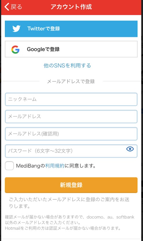 使用するにはまず、ユーザー登録をする必要があります。Twitter、Googleアカウント、もしくはニックネーム・メールアドレス・パスワードを入力して新規登録をすると、マンガ制作が可能になります。