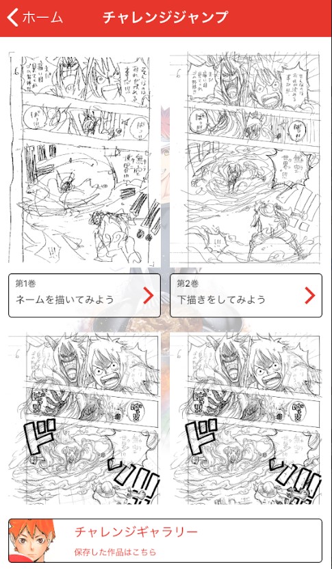チャレンジジャンプでは、実際に掲載されているマンガを基に、ネーム、下描き、キャラクターのペン入れ、背景のペン入れ、効果線、ベタ塗り、トーン貼りの7つに分けて、練習することができます。各作業によって練習するマンガも異なっており、ONE PIECE、銀魂、BLEACHなどさまざまです。ジャンプファンにとっては楽しく作業しながら練習できるといううれしいポイントになっています。