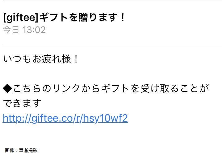 そして、実際もらうとどんな感じなのか、ということもご紹介いたします。今回は自分あてにメールで贈ってみましたが、同様にラインでも贈ることが可能なので、かなりお手軽。