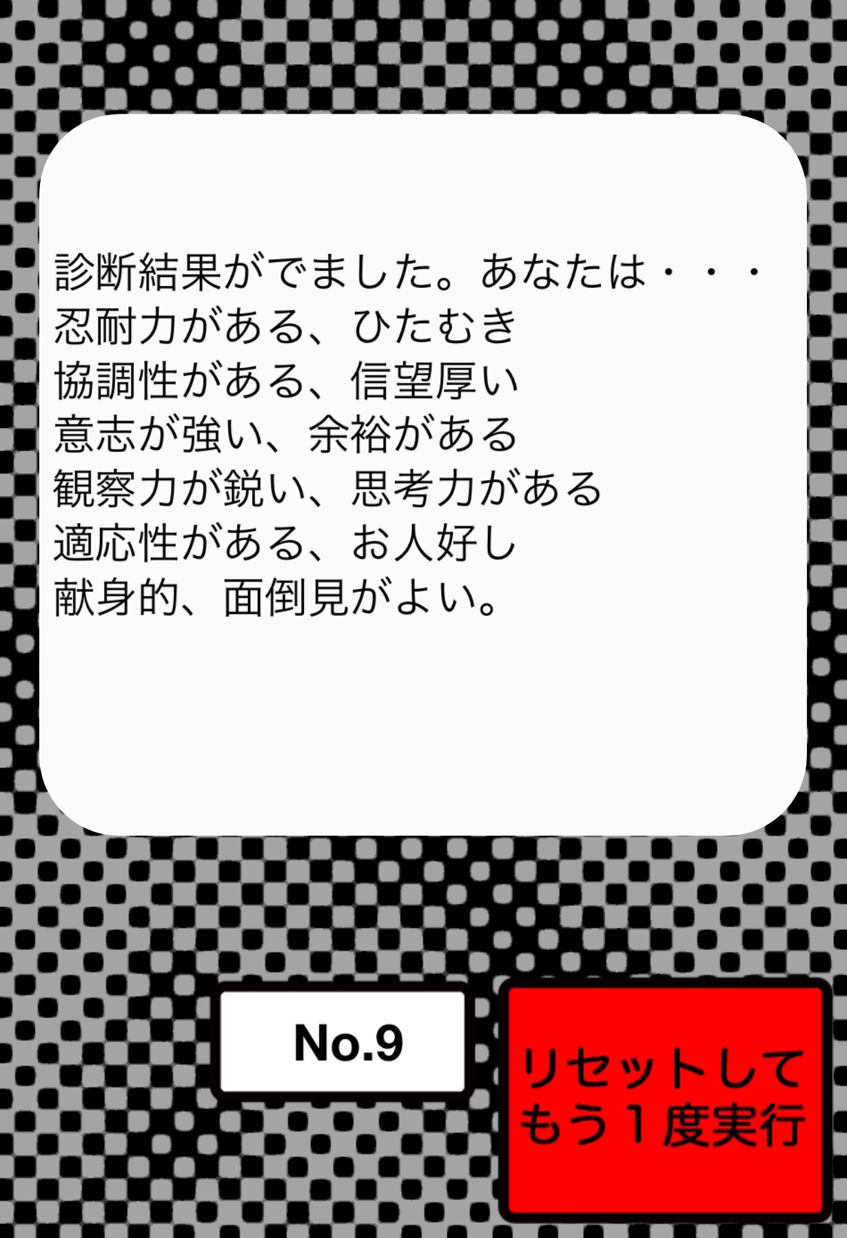 上図のように性格の特徴だけでなく、気を付けた方がいいことの「ご使用状の注意」や、落ち込んだり元気がない時の対処方法の「故障かな?と思ったら」も解説されます。診断結果は実際の取扱説明書とそっくりに作られているので、まるで本当に自分が製品のようになった気分になり、とても面白いです!診断結果には参考になることもたくさん書かれているので、実際の日常生活で活かせることができます。また、数十問のかんたんな質問に答えるだけ、と診断に時間がかからないので、スキマ時間や空いた時間の暇つぶしにもぴったりなアプリです。
