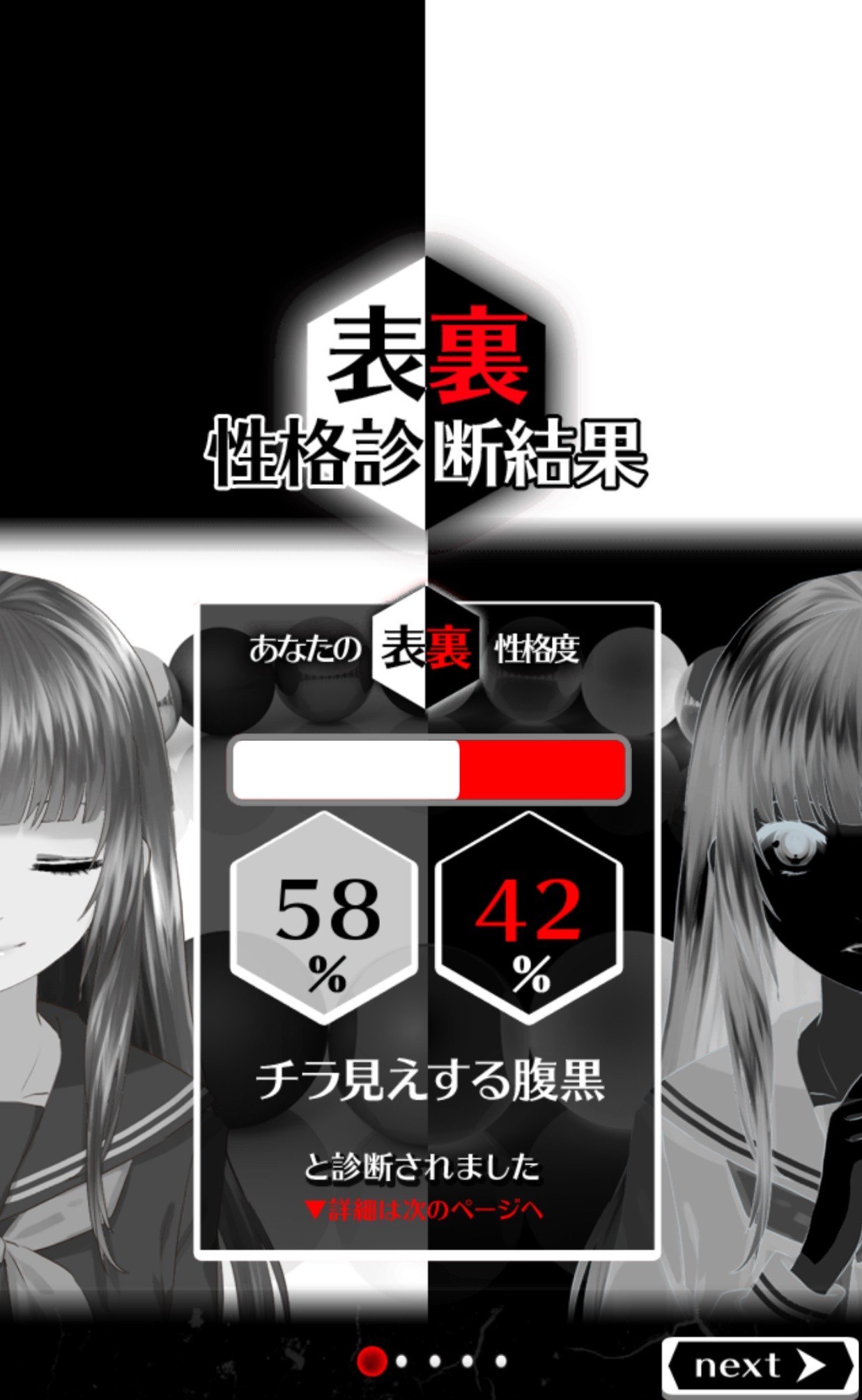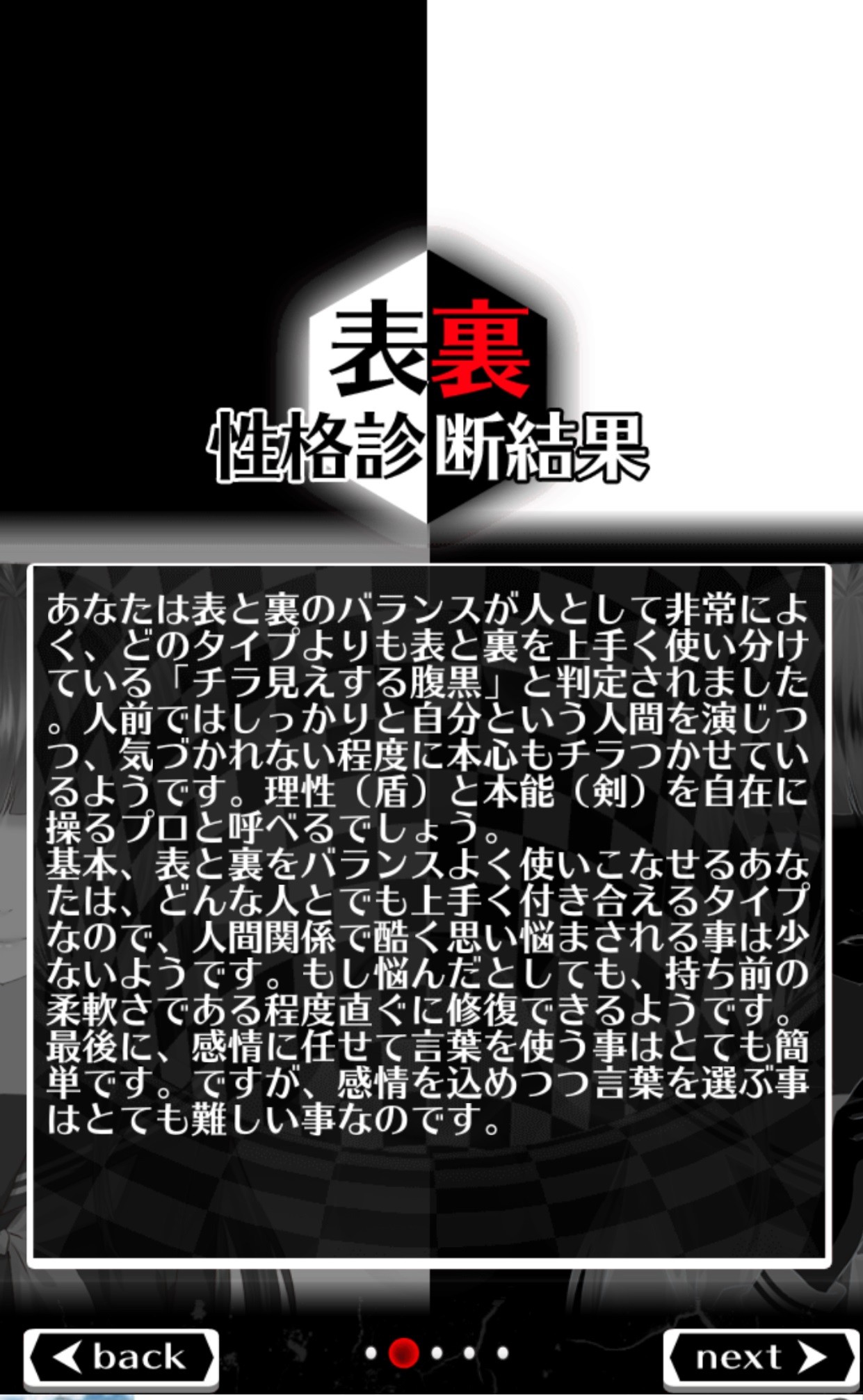 次のページでは、上図のような、普段どのように表と裏の性格を使い分けているかという詳細な診断結果が表示されます。この診断結果を見て「確かにそうかも!」というように、普段自分がどのようにして建前の部分と本音の部分を使いわけているか納得できる部分が多くて驚きです!問題数も30問と短いので、空いた時間やスキマ時間の暇つぶしにもぴったりですね。また、このアプリは気軽にできるカジュアル診断アプリなので、気の置ける友だちと一緒に診断すれば「こんな部分あるよね!」と盛り上がって楽しむこともできそうです。
