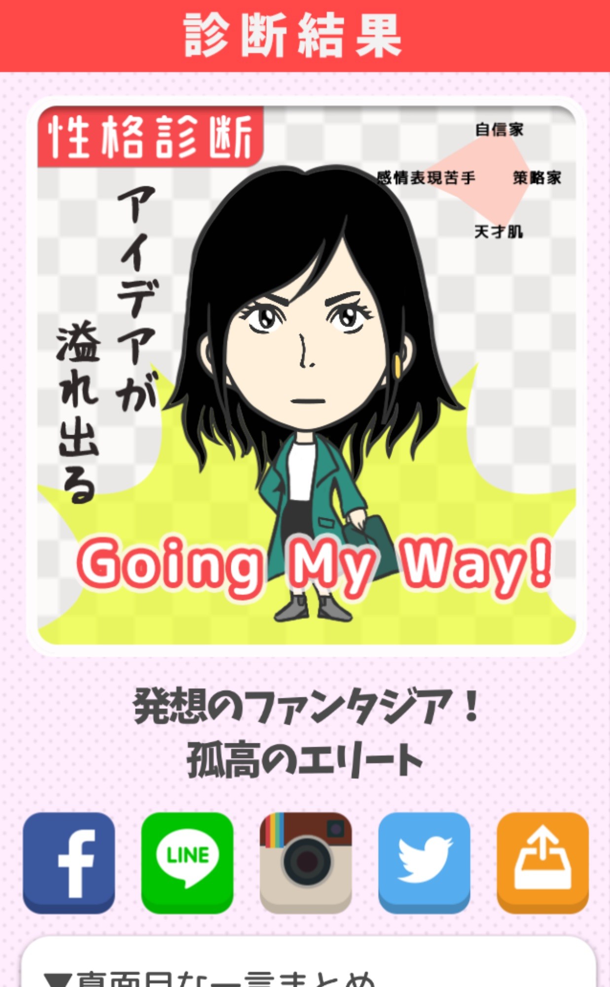 いくつかの質問に答え終わると、イメージする似顔絵と一緒に診断結果が表示されます。4択の中から選んで答えていくだけの簡単な操作方法なので、さくさくと進み、ストレスなく操作することもできますし、質問内容もとても簡単なものばかりなので気負いせずに診断することができます。上図は性格診断の結果ですが、この診断ではキャッチコピーや特性、恋愛、性格の似ているキャラ・偉人、基本性格など、項目別に細かく性格が診断されて驚きです!とてもよく当たっていますし、「自分はこんなキャラなのか」「こんなキャラとして見られているのか」と再認識できます。