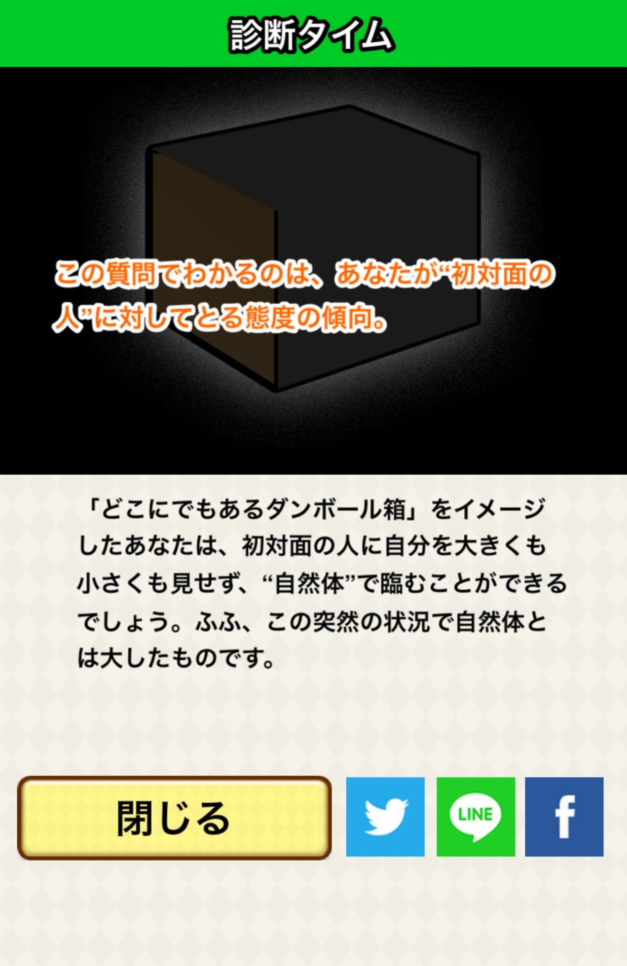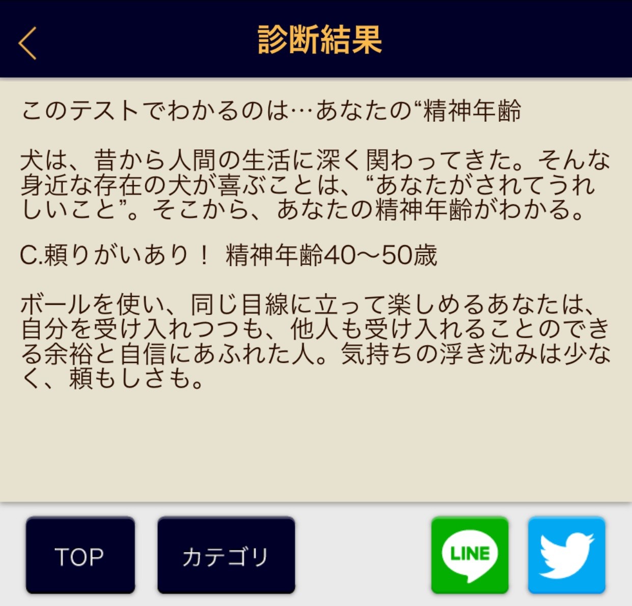 答えを選ぶと、上図のように「選んだ診断テストで分かること」と「診断結果」が表示されます。上図の診断テストでは精神年齢が分かりますが、行動パターンや、結婚相手、人付き合いの仕方など、選ぶ診断テストによって分かることがさまざまに異なります。しかも、診断テストは約100個と種類豊富で、気になった診断テストをしていくことで自分の性格をどんどん知ることができます。また、診断テストの1問の質問に答えるだけで、すぐに結果が分かるので、空いた時間やスキマ時間や、友だちや知り合いと一緒に診断をしても楽しめること間違いありません!