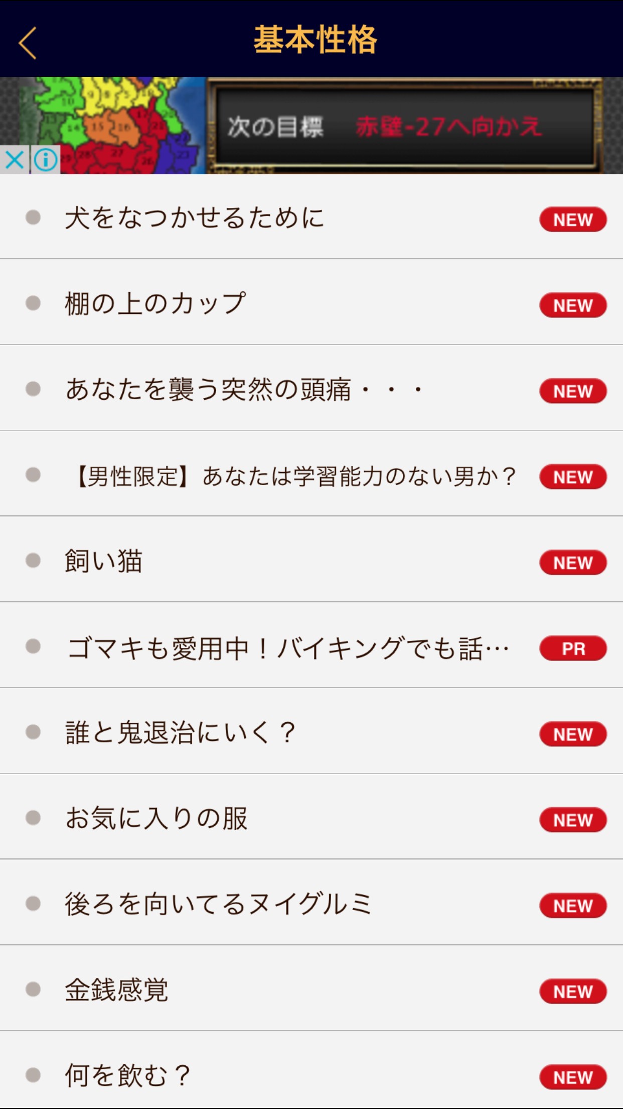 このアプリは、「基本性格」「恋愛傾向」「深層心理」「大人の診断」の4つにカテゴリ分けされており、その中から1つのカテゴリを選ぶと上図のようにたくさんの診断テストが表示されます。表示された質問の中から、気になる診断を選びます。