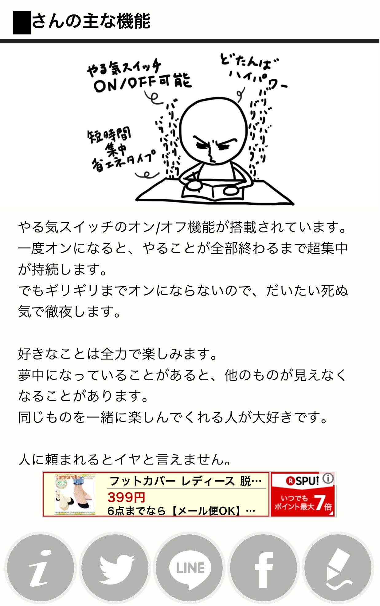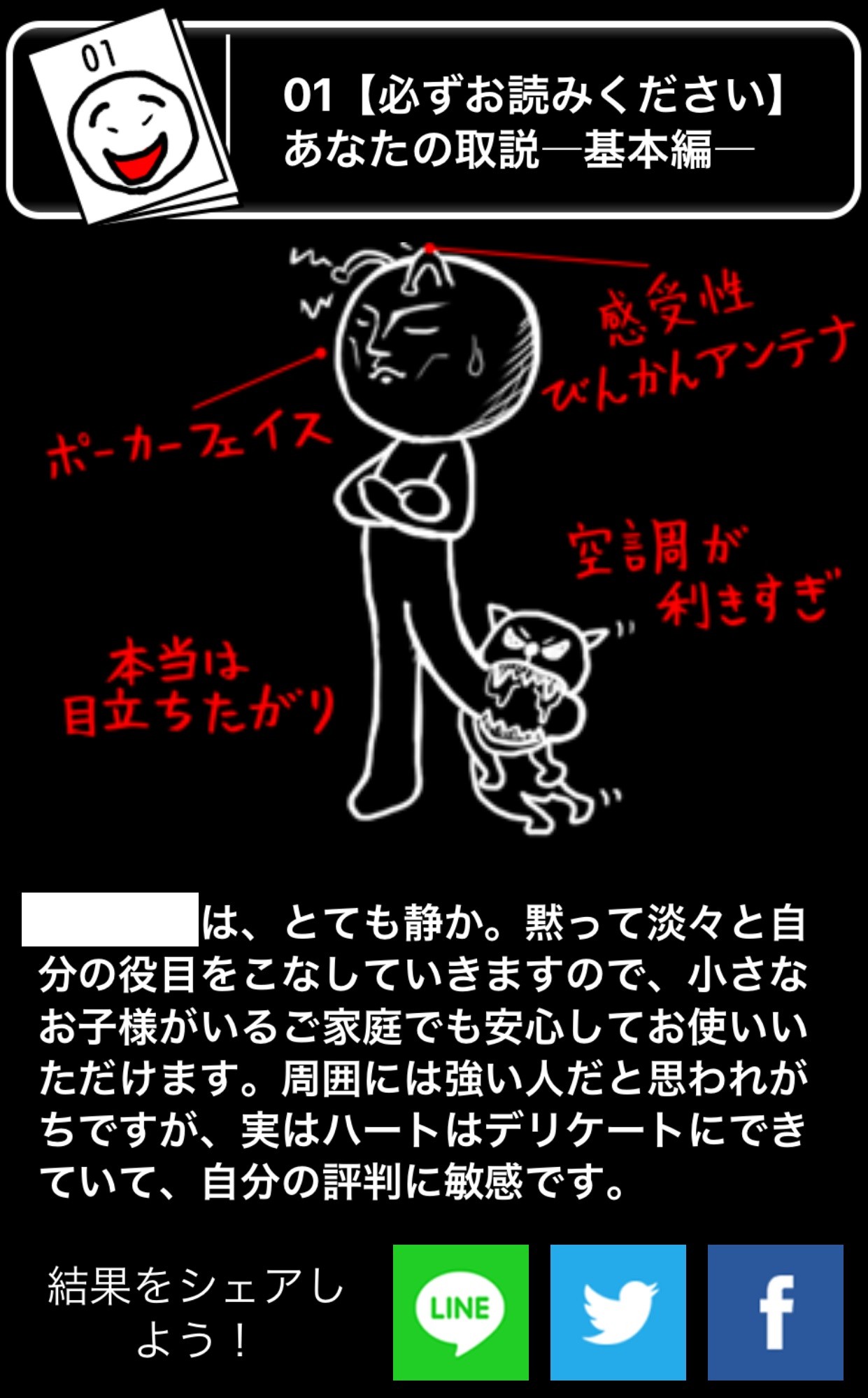 「取扱説明書」を作成すると、性格の特徴や、自分をどう取り扱ってよいかという注意事項やトラブルシューティングなどを、上図のようにユーモアたっぷりに面白く診断されます。