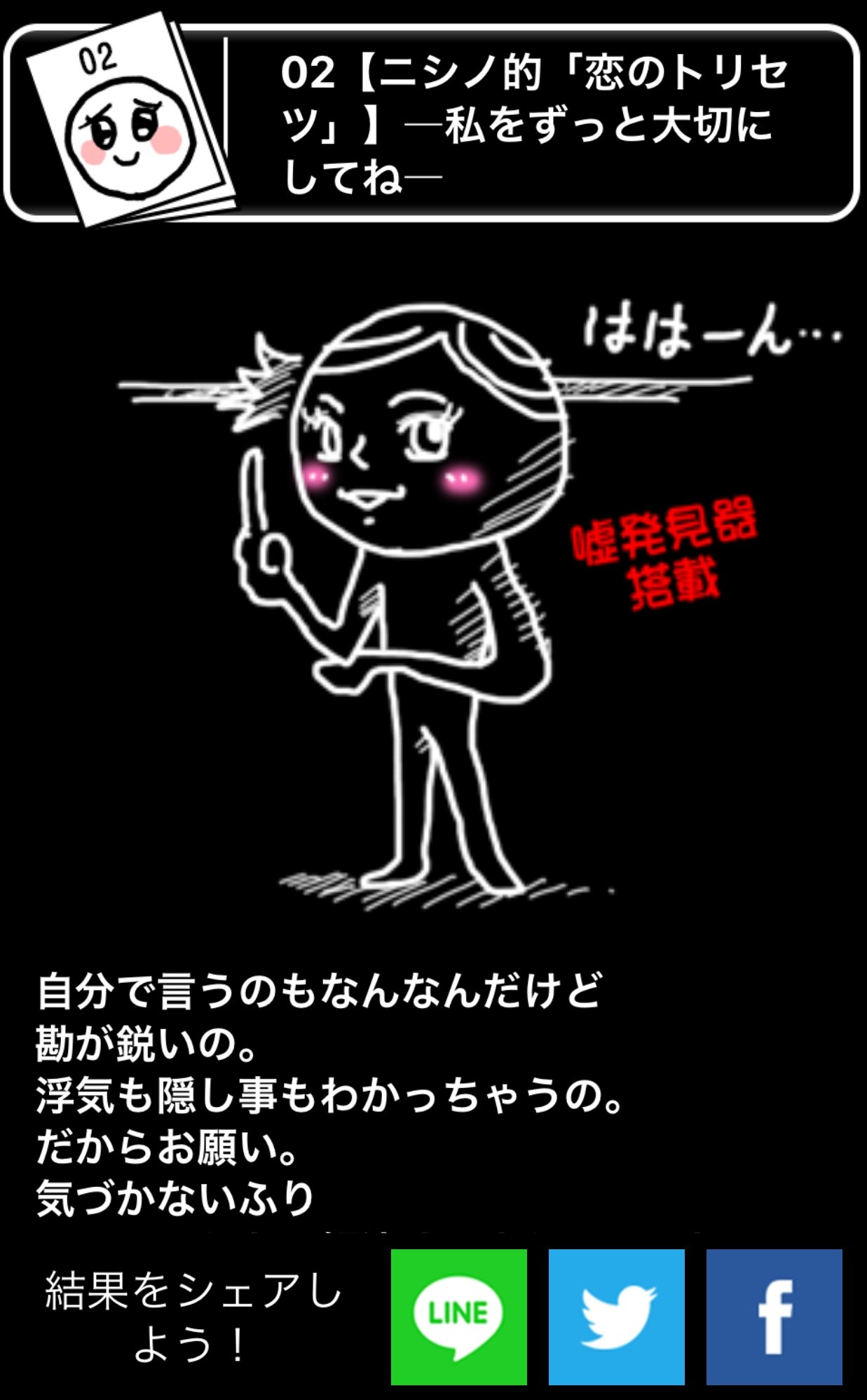 質問に答えると、どんなことが分かるのか、診断結果が表示されます。「究極の選択」の質問の診断テストだけに、診断で分かることも一風変わっていて面白いです。