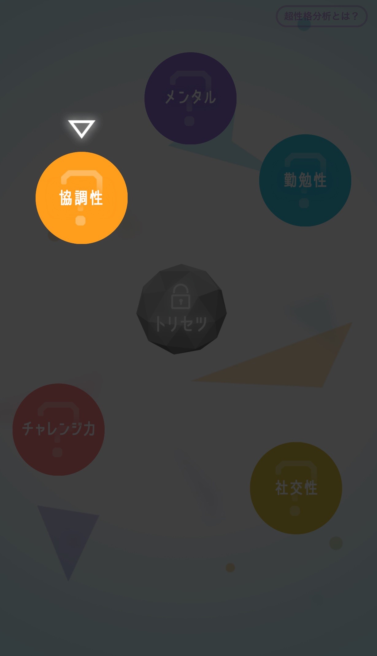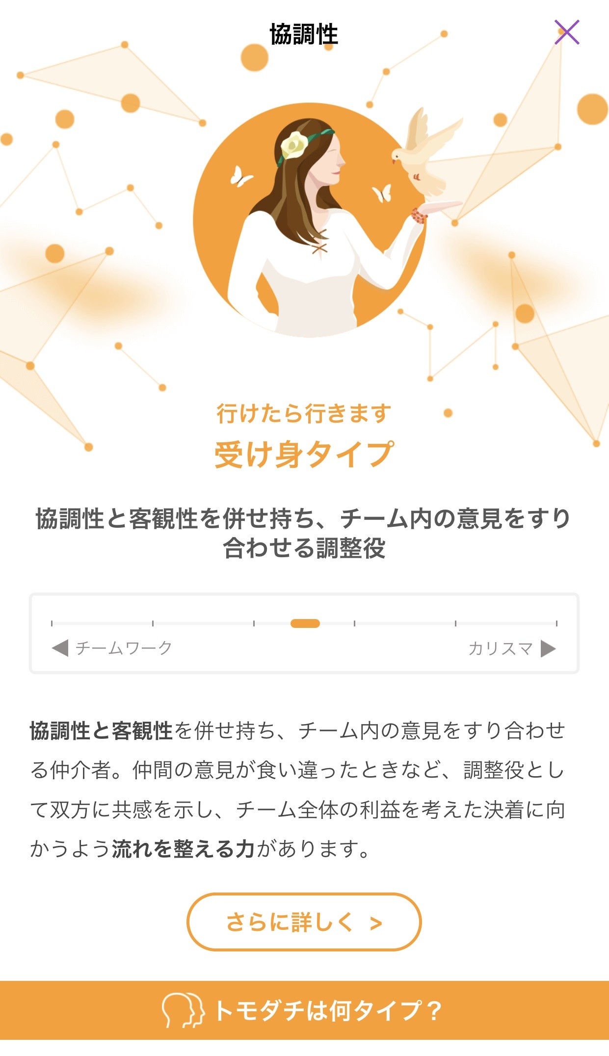 このアプリで名前、生年月日、性別を入力すると、上図のようにな図が表示されます。このアプリでは「協調性」「メンタル」「勤勉性」「チャレンジ力」「社交性」の5つの項目ごとに性格の特徴を診断することができます。