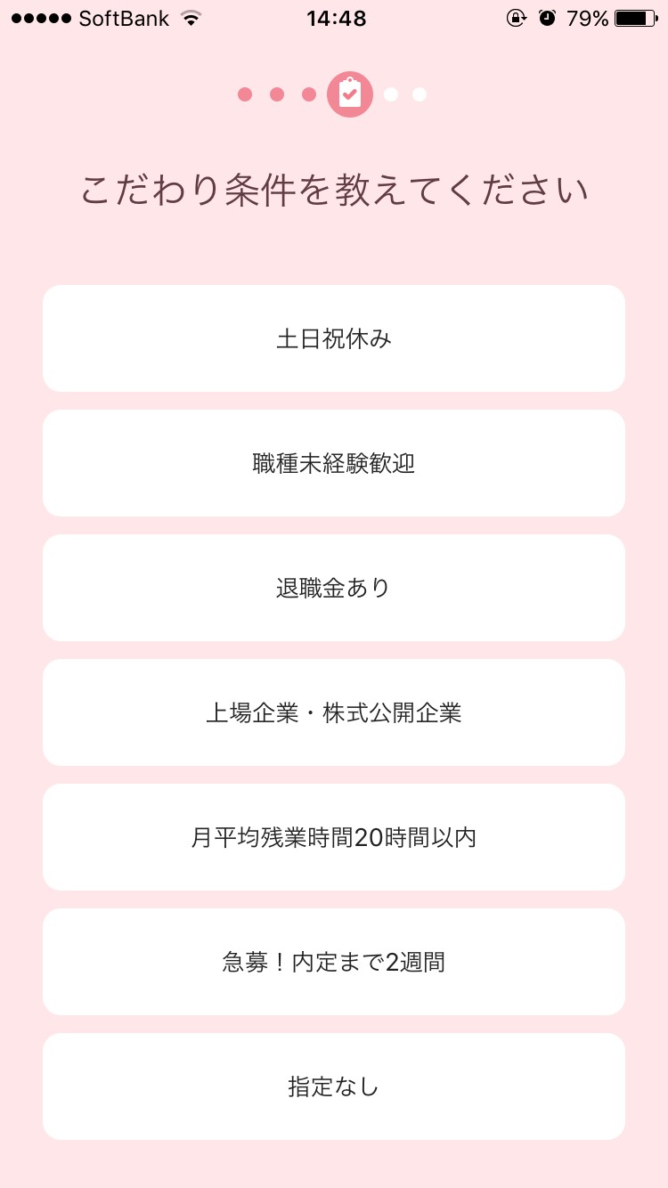 正社員雇用系のアプリでは見やすく、初期画面でこだわりポイントなどを診断してくれるのが良いです。