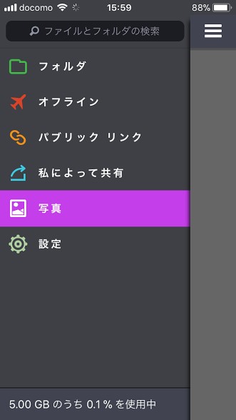 カメラのバックアップやアプリのロック、ログアウト、どのくらいの容量を使っているのかなどの情報がわかります。
