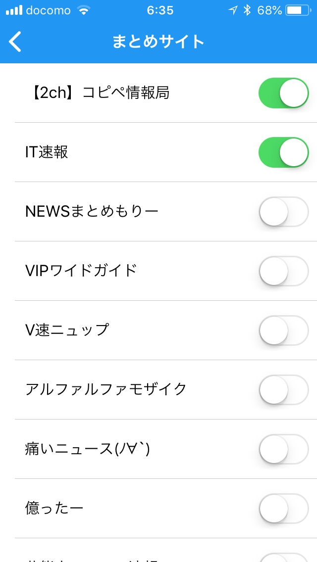 「表示サイトの選択」というのは、まとめサイトの中から興味のあるサイトのみをオンにするというシステムです。「まとめひあ」を初めて起動した時、まとめ記事は1つも表示されません。自分で選択したまとめサイトの記事のみを取得する設計になっているのです。