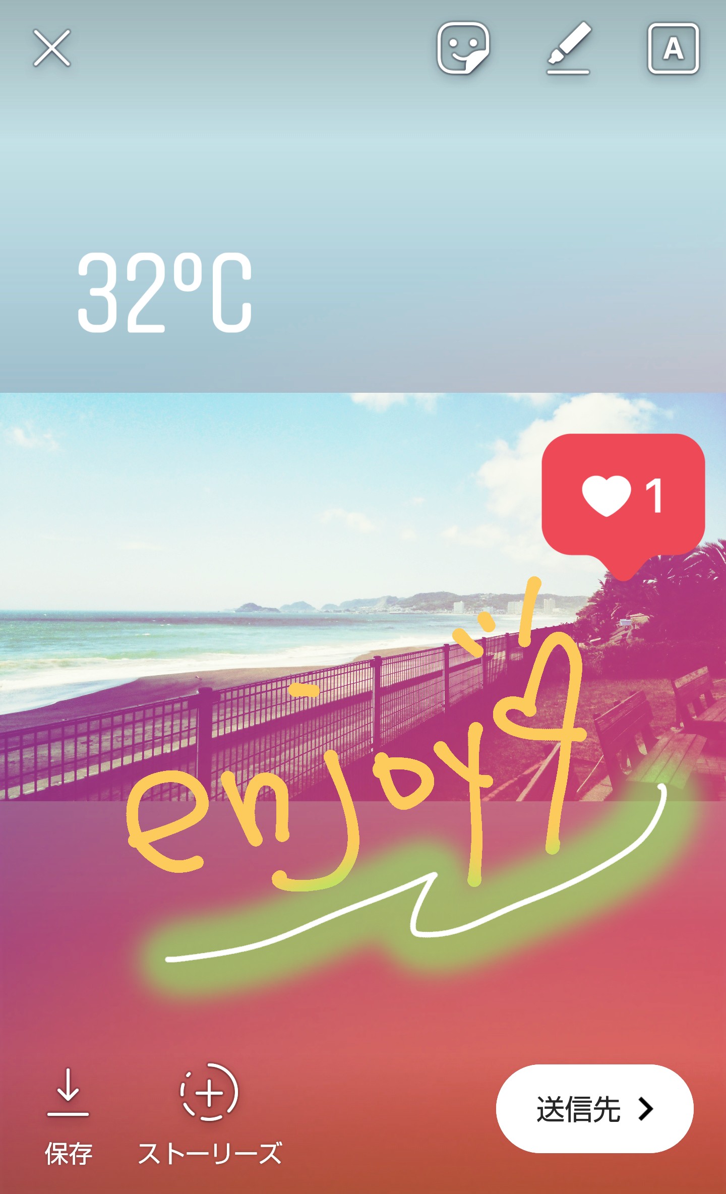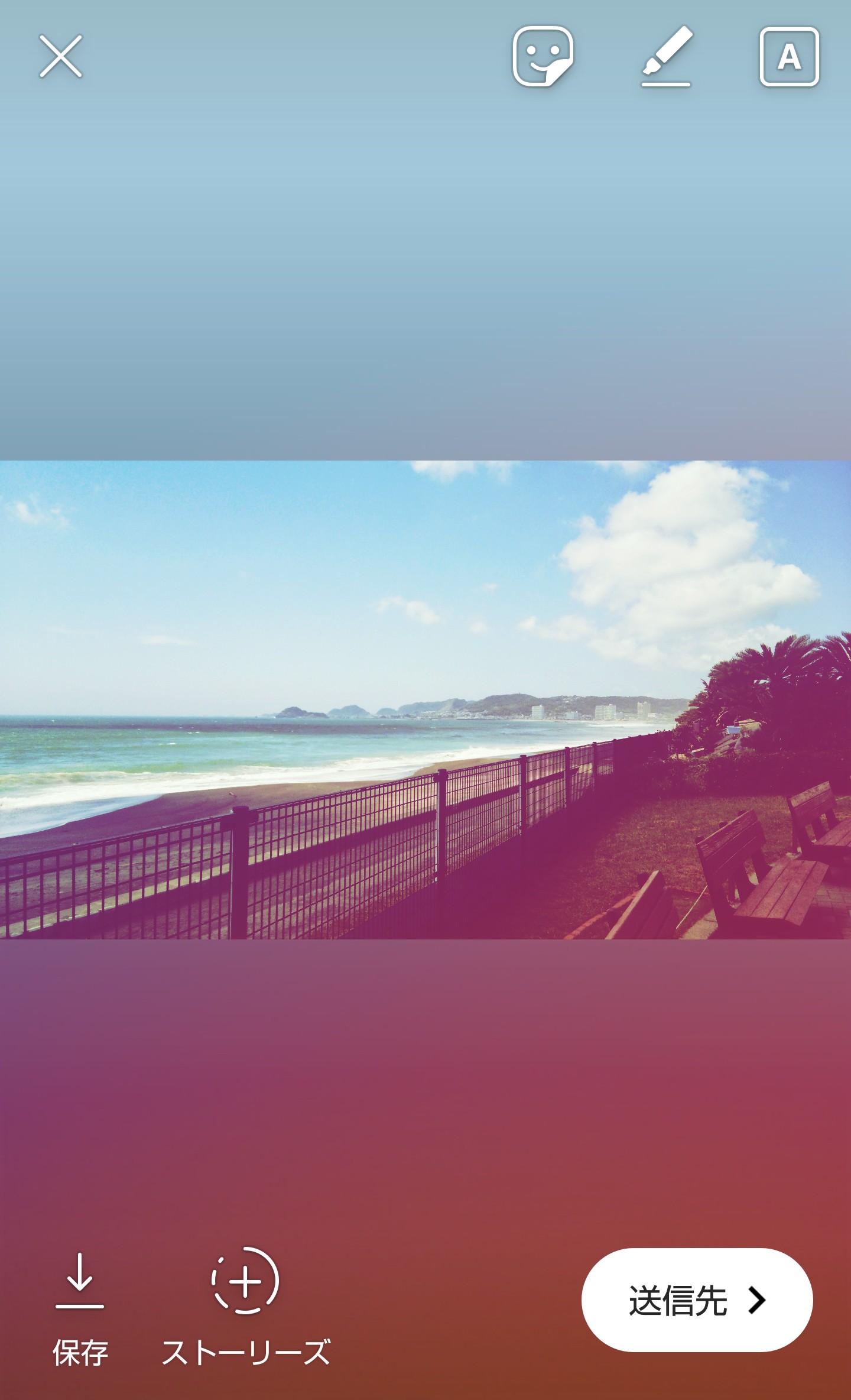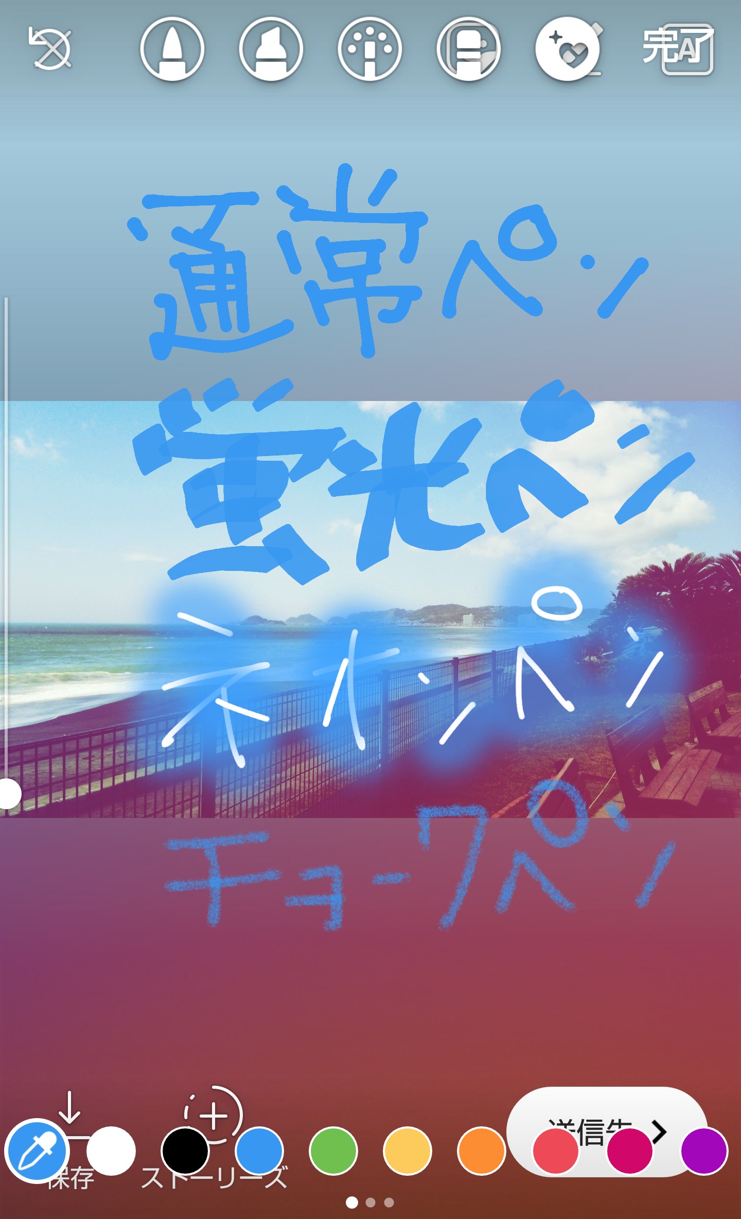 シェアする画像が決まったら編集していきます。右上に表示されている顔のマークを押すとスタンプメニューに、ペンのマークを押すと手書きペンメニューに、アルファベットマークを押すとテキスト文字入力メニューになります。スタンプの大きさやペンの太さ調整も可能です。間違えてスタンプを押してしまっても長押ししながらドラッグして、ゴミ箱マークに入れると削除ができます。編集の仕方は無限大なので色々試してみましょう!