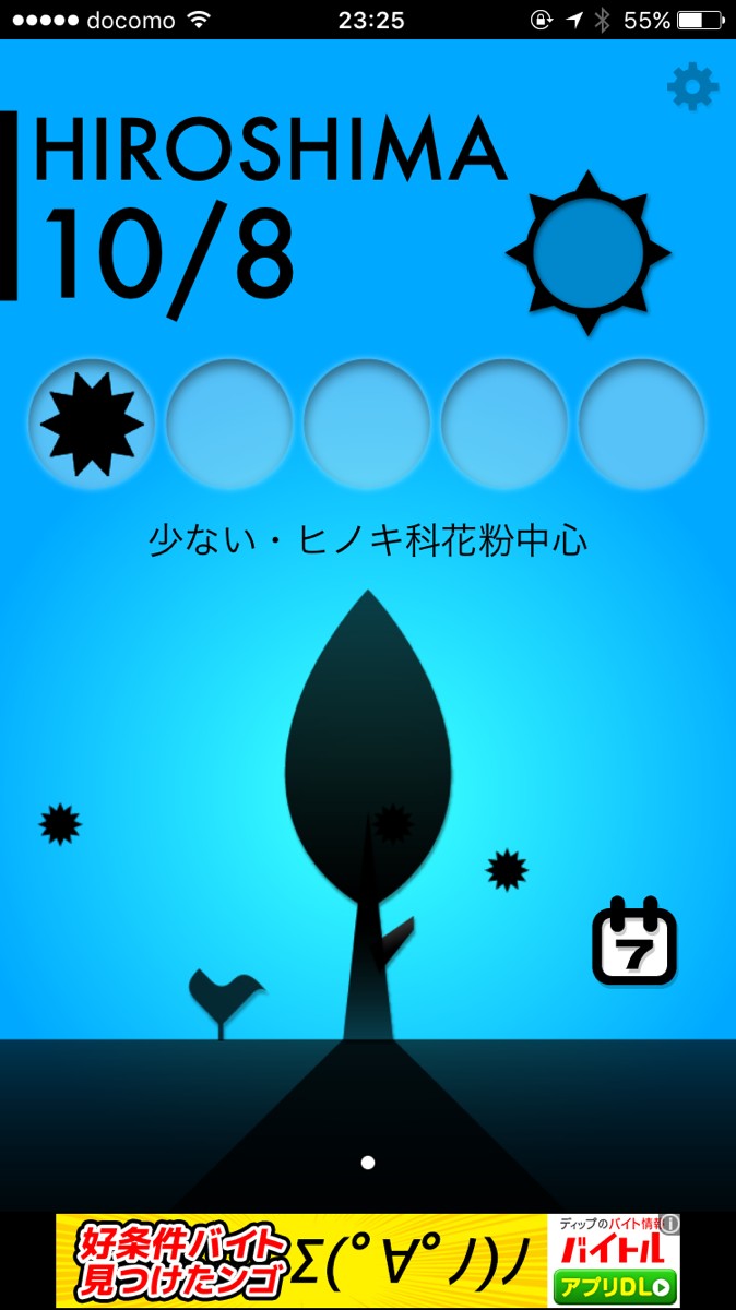 「花粉チェッカー」は、花粉飛散情報に特化した天気予報アプリです。このアプリでチェックできる花粉は、スギやヒノキなど季節によって変わります。アプリの画面は飛散している花粉の量で背景色が変わり、注意情報と共に表示。さらに、その日の天気も同時に確認することができます。登録する場所は、現在地を含めて最大5カ所まで登録可能です。1週間分の天気予報と花粉情報をチェックできるので、花粉症の方に特におすすめします。