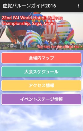 「佐賀バルーンガイド2016」は、『佐賀インターナショナルバルーンフェスタ』公式ネットチームの協力で開発された熱気球世界大会のガイド用アプリです。