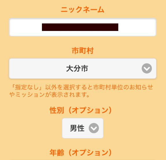 「おおいた歩得」のアプリを起動したら、初回のみプロフィール入力が必要です。
