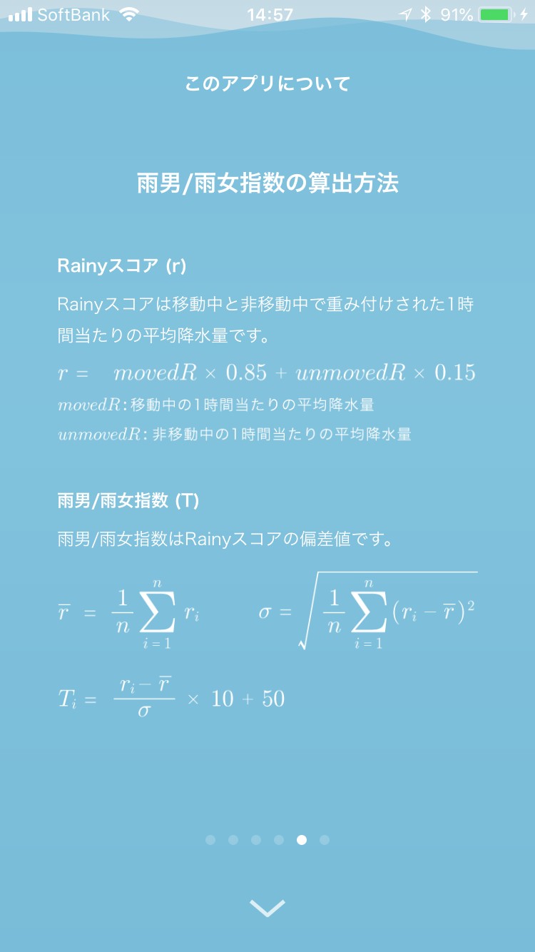 雨男、雨女判定の基準に使用される「rainyスコア」は移動中の平均降水量と、移動していないときの平均降水量から計算して決められています。具体的には「移動中の1時間あたりの平均降水量×0.85+非移動中の1時間あたりの平均降水量×0.15」という計算式になっています。例えば、外に出ているときの平均降水量が1mm、非移動中の平均降水量が0.5mmだとすると1×0.85+0.5×0.15となり、「rainyスコア」は0.925ということになります。