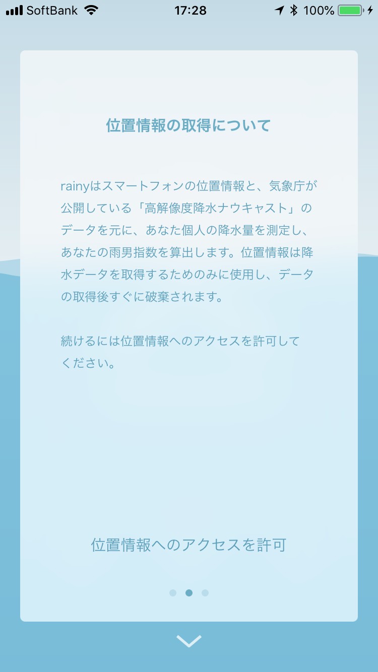 そこで画面下部の「次へ」の文字をタッチすると、次に位置情報の取得について、得た位置情報のデータは、降水データを取得するためのみに使用し、データの取得後はすぐに破棄されるということを書いた画面が表示されるので、「位置情報へのアクセスを許可」と書かれた文字をタッチしてください。