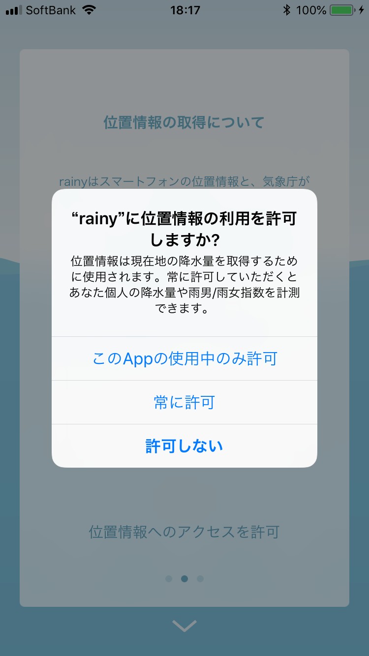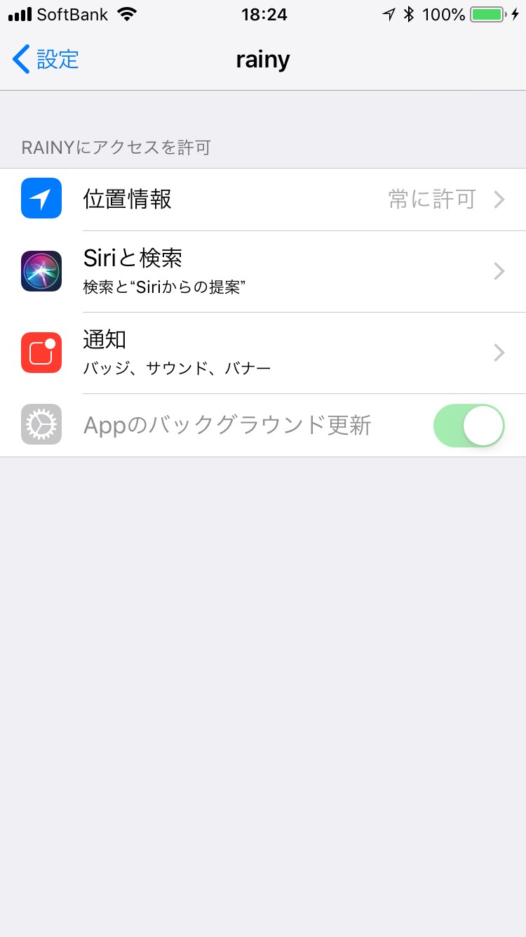 また、初期設定で通知や位置情報の取得について、誤って選択してしまった場合には、アプリ内ではなく、端末の設定画面から「rainy」を選ぶと、位置情報の許可や通知の設定をすることができるので、そちらを使って設定を変更することができます。特に位置情報の取得については「常に許可」にしておかないと、データを取得することができないので、絶対に「常に許可」にしておきましょう!