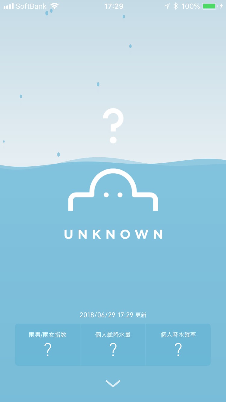 初期設定が終わったあとは、判定が出るまでおよそ一週間、データが蓄積されるまで待ちましょう。位置情報を取得させるために、バックグラウンドでもいいのでアプリを起動したまま、端末を常に持ち歩くことも忘れないように!そうして約一週間後には「雨男/雨女指数」が算出され、画面に「UNKNOWN」ではなく、判定されたステージが表示されるようになるはずです。