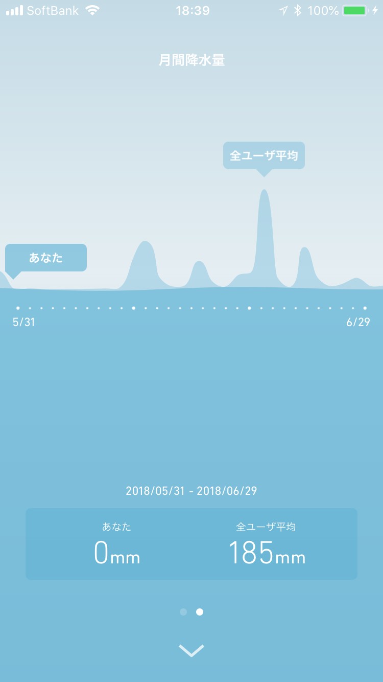 初期画面を下から上にスワイプすることで、全ユーザーの月間平均降水量や週間、月間、雨男、雨女ランキングを見ることもできます。自分のデータと平均を比べることで、自分がどれだけ雨男、雨女なのかを数字で知ることもできるので、たまに確認するのも面白いです!