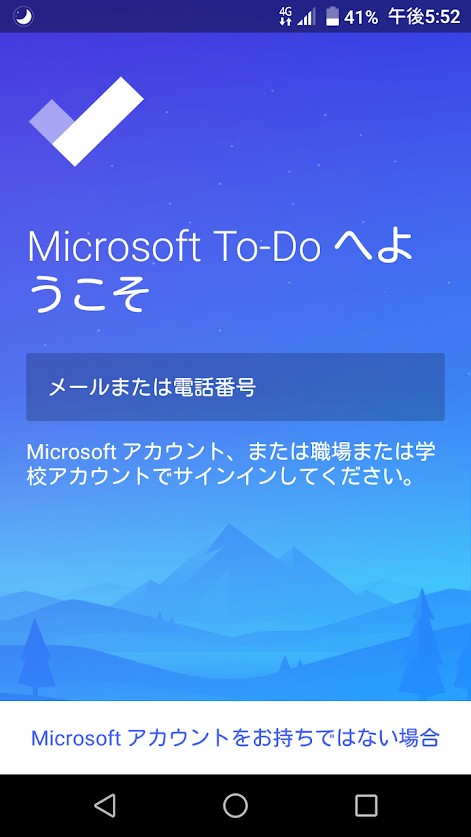 インストール後にアプリを起動するとサインイン画面が表示されます。Microsoftアカウントを持っている場合は既存のものを入力、それ以外の場合は下部に表示される「アカウントをお持ちではない場合」をタップし新規アカウント登録します。