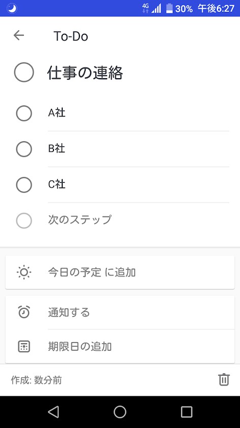 To-Doにはステップを追加することもできます。例えば仕事の連絡をする場合、いくつか段階を踏まなければならないこともありますが、そのような時には各段階ごとにチェックできるようになっています。1つのTo-Doについてどのくらい進行できているか確認できるので、タスクを細かく管理したいときには役立つでしょう。