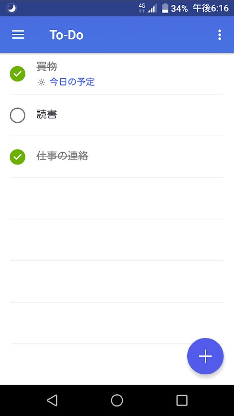 To-Do一覧画面で各項目を右にスワイプすると今日の予定に追加され、当日の予定リストに反映されます。 作業終了後はタスク左側の円をタップすると緑色のチェックがつき、タスクに取り消し線が表示されます。