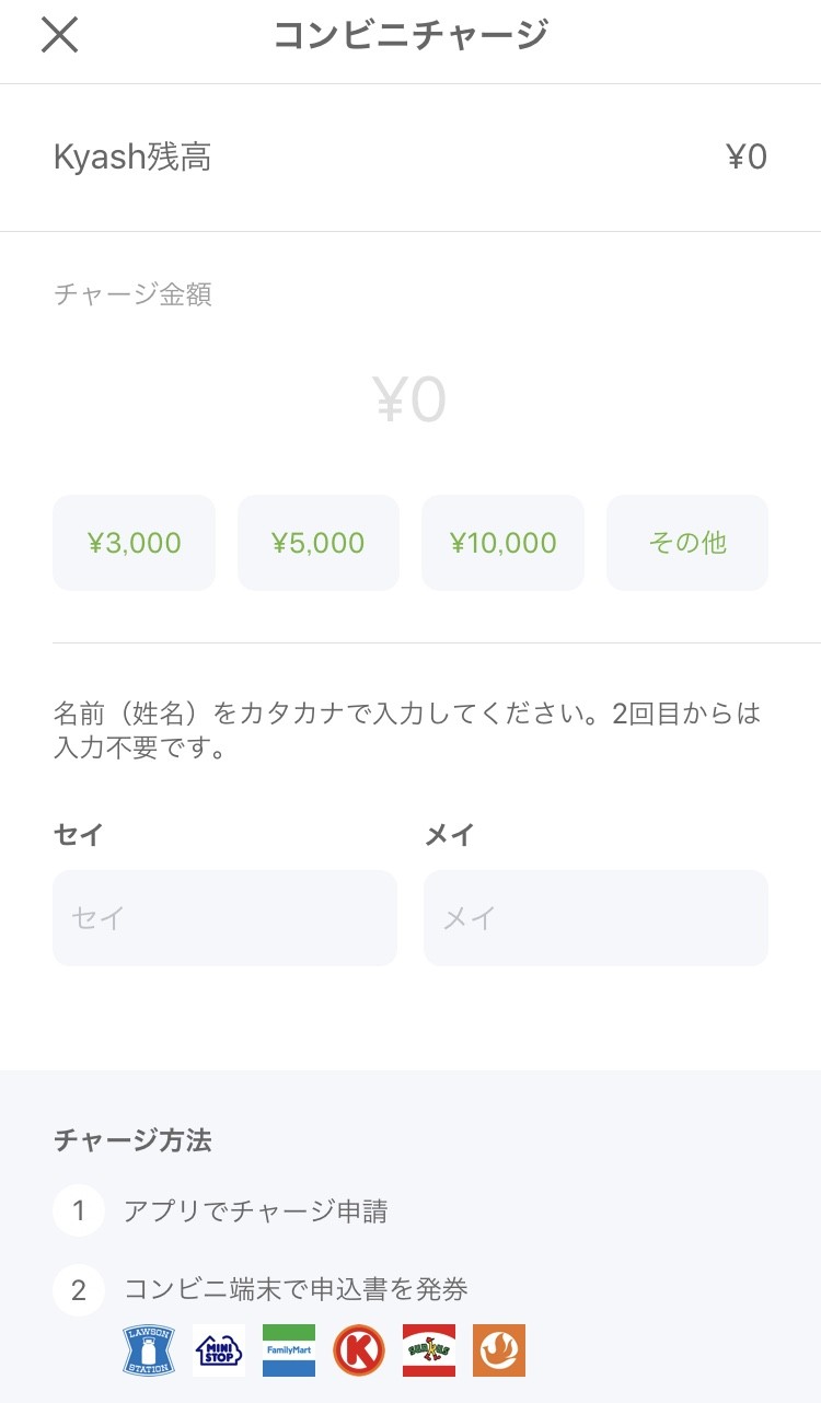 コンビニチャージはアプリでチャージ申請をして、コンビニ端末で申込書を発券します。レジで支払うことでチャージ完了です。