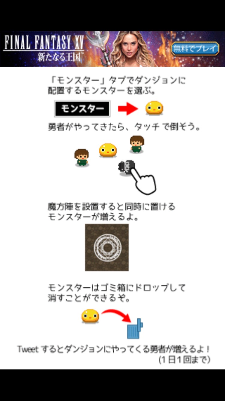 モンスターを設置→放置→勇者たちがくる→タップで捕獲→放置