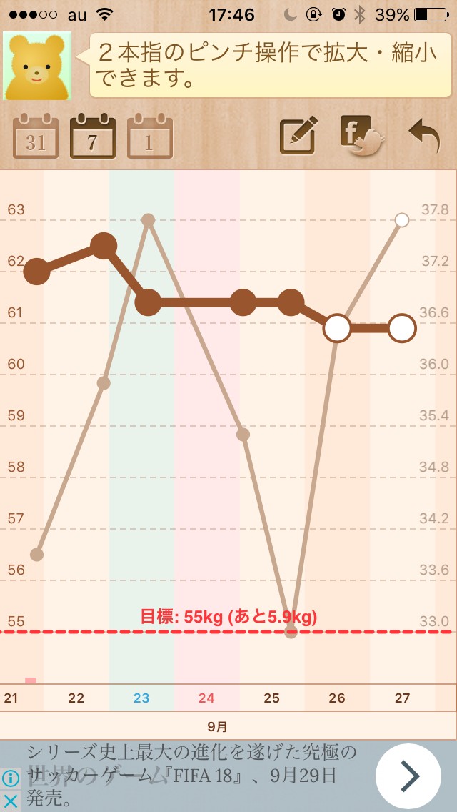 プラスで体脂肪率の記録も可能で、体重と同様にこちらもグラフ表示されます。