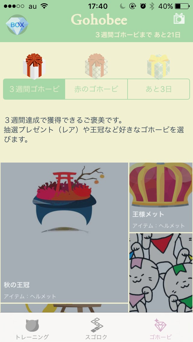 また、「ゴホービ」というアプリ名の通り、頑張った日数に応じてアイテムがプレゼントされます。