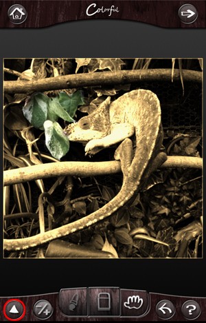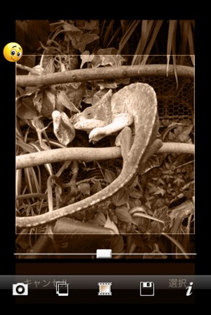 こちらも写真全体にセピア加工を加えることができます。まず、右上のボタンをタップすると、ボタンが四角の中を移動するスライダーに変化。このスライダーを動かすことで、完全なセピアカラーから色味を残した色調まで、直感的に調節することができます。