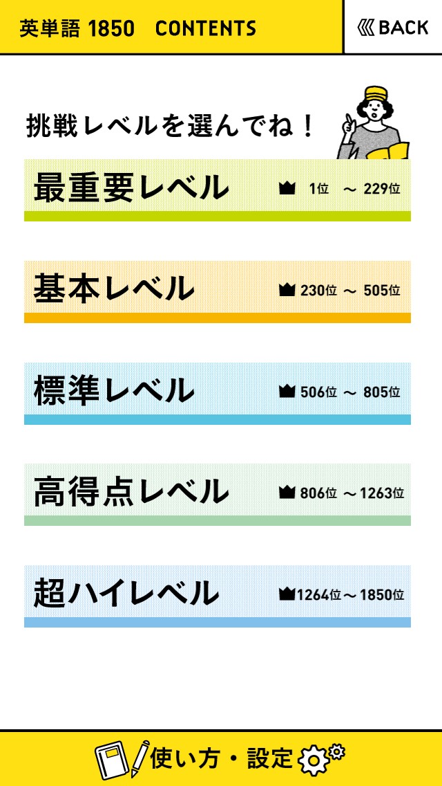 3つのレベル、基礎900語、頻出850語、難関550語に分かれており、