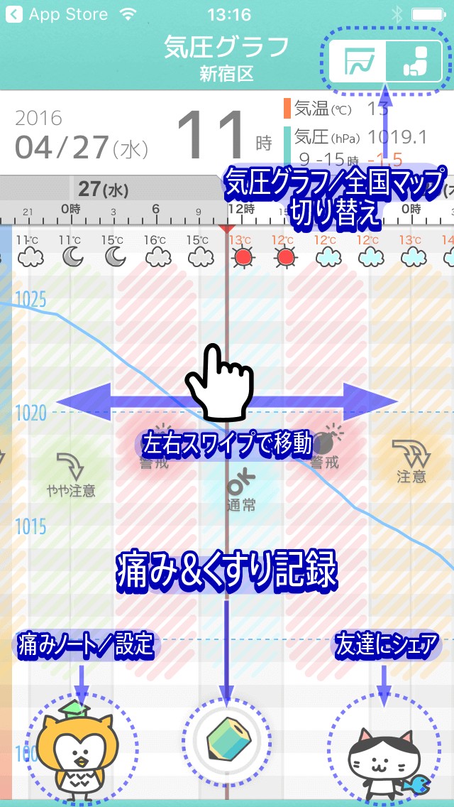 気圧の変化を予測して、頭痛が起きそうなタイミングを教えてくれるアプリ。