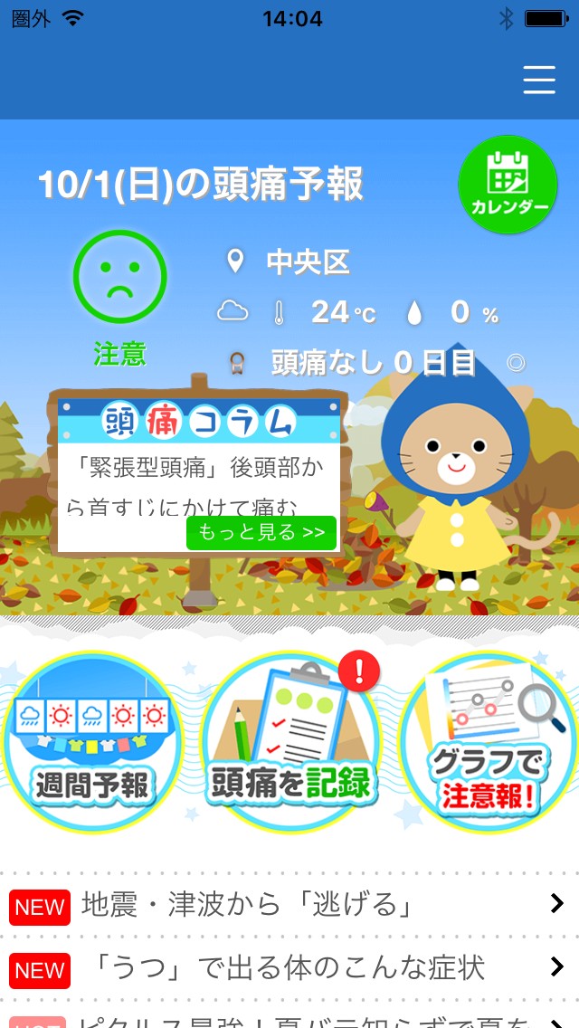 アプリを起動すればTOPページで当日の天気、頭痛危険度がすぐわかるのは便利ですね。