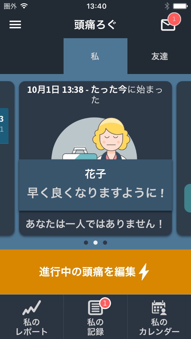 TOPページは左右スワイプで頭痛の起きた時間を直感的に記録可能。