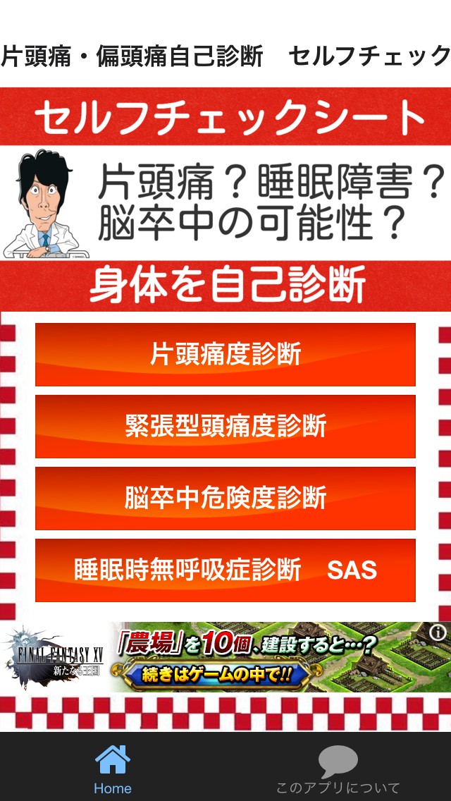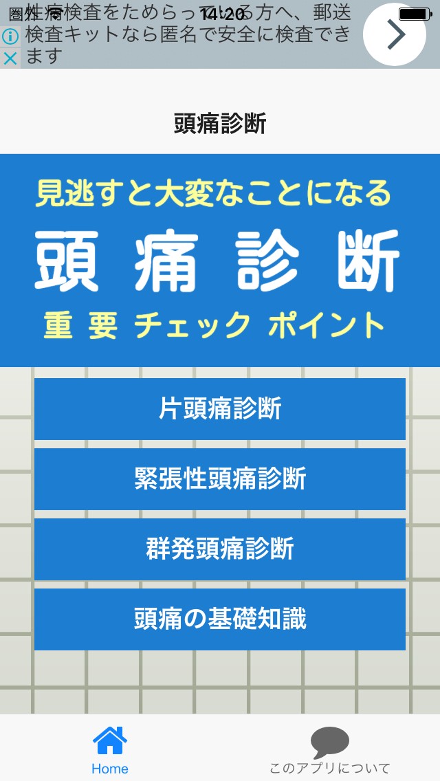 質問に〇✕で答え、片頭痛、緊張性頭痛、群発性頭痛の中で、自分の頭痛がどのタイプの頭痛なのか?診断するアプリです。