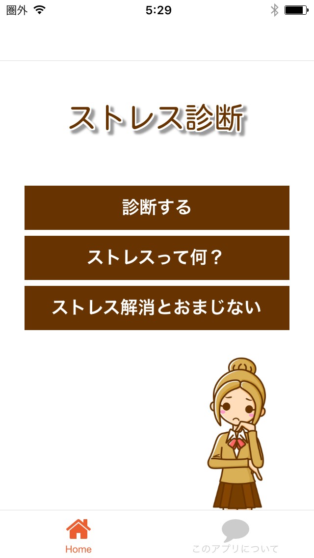学校に行くのがおっくうだ、など学生向きの質問を含む20の質問に〇✕で回答し、ストレスの度合いをチェックするアプリ。