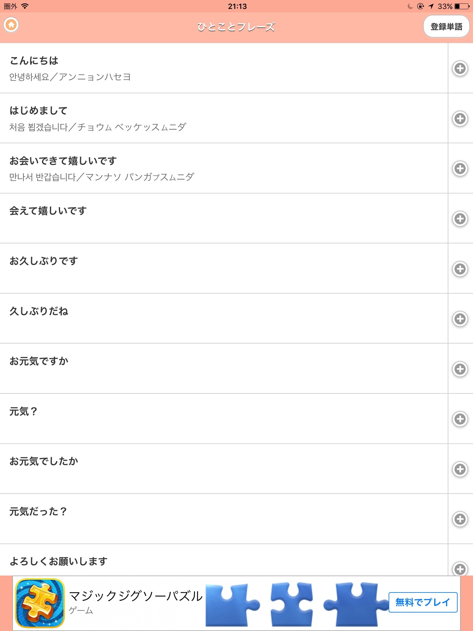 旅に便利な韓国語の基本フレーズが収録されており、フレーズをタップするとネイティブの発音音声を確認できます。