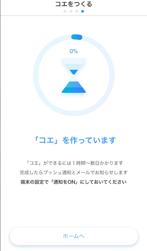 読み上げが完了次第、「コエ」の作成に移ります。作成には1時間~数日かかります。できると登録したメールアドレスに通知してくれるので、それを待ちます。今回は10分程度で「コエ」の作成通知が届きました。